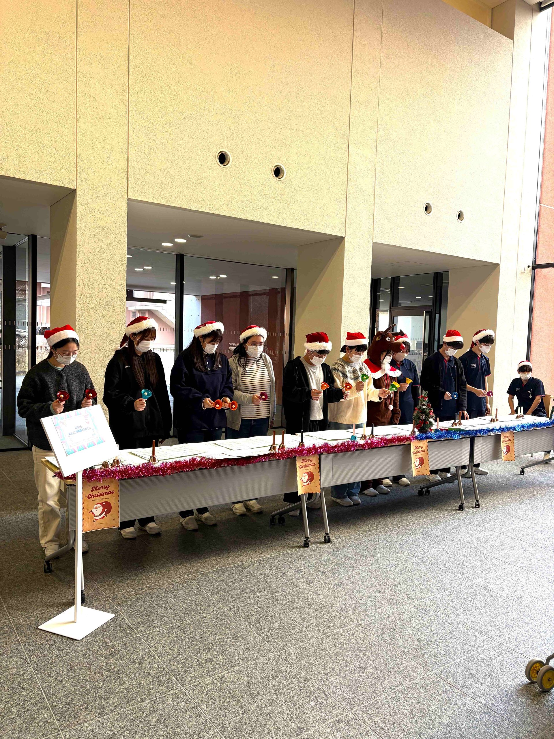 翌23日(火)は、全校生の前で演奏しました。日々講義や実習に全力で取り組んでいる学生にとって、ハンドベルの音色が癒しのひとときになりました。